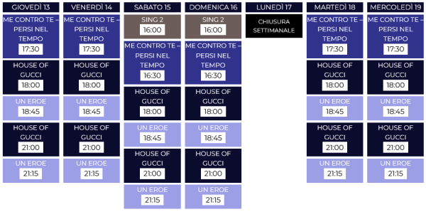 Per i più piccini ancora una settimana per vedere ME CONTRO TE IL FILM – PERSI NEL TEMPO. Tra mummie e nuovi cattivissimi nemici Sofì e Luì devono tornare ai nostri giorni da… l’Antico Egitto, dove si trovano magicamente intrappolati. Ancora in sala il bellissimo SING 2, seconda parte del film di animazione che ha incantato milioni di ragazzi in tutto il mondo. Musica e cast di doppiaggio straordinario per un film coinvolgente ed originale, che piace anche agli adulti.