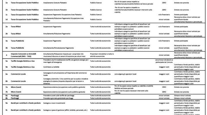 Alcuni interventi, come ad esempio l’ampliamento gratuito dello Spazio riservato a Dehors e Plateatici, Esposizione in esterno delle attività commerciali, i Buoni in collaborazione con le imprese del territorio e le Sperimentazioni di pedonalizzazioni legate ad eventi particolari, potrebbero essere attivate rapidamente senza costi per le casse comunali.