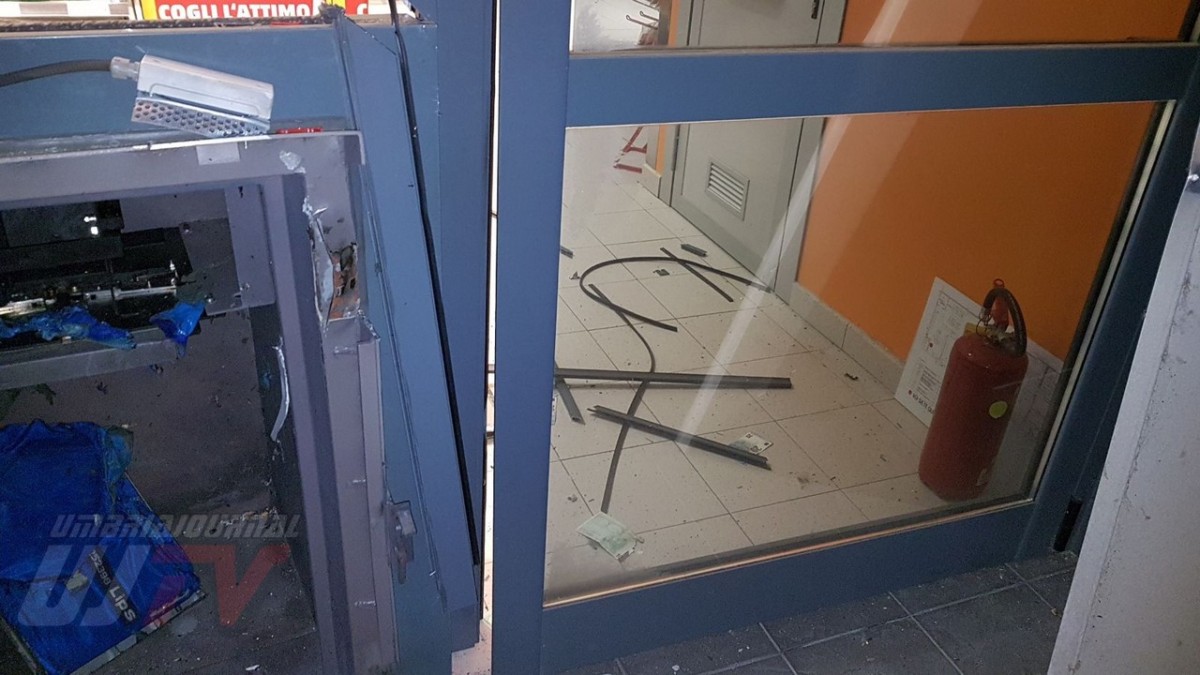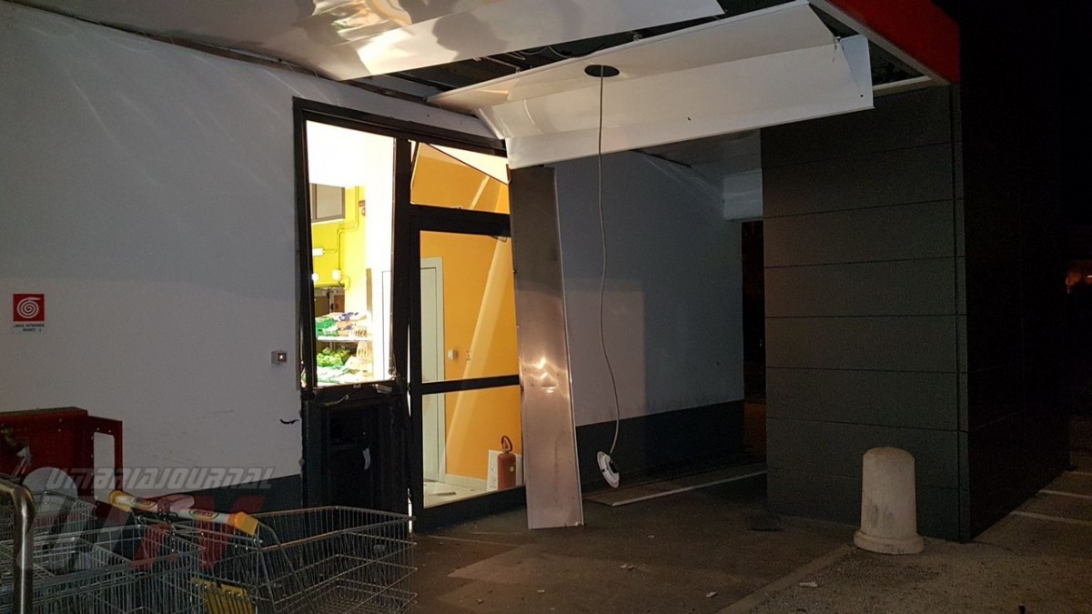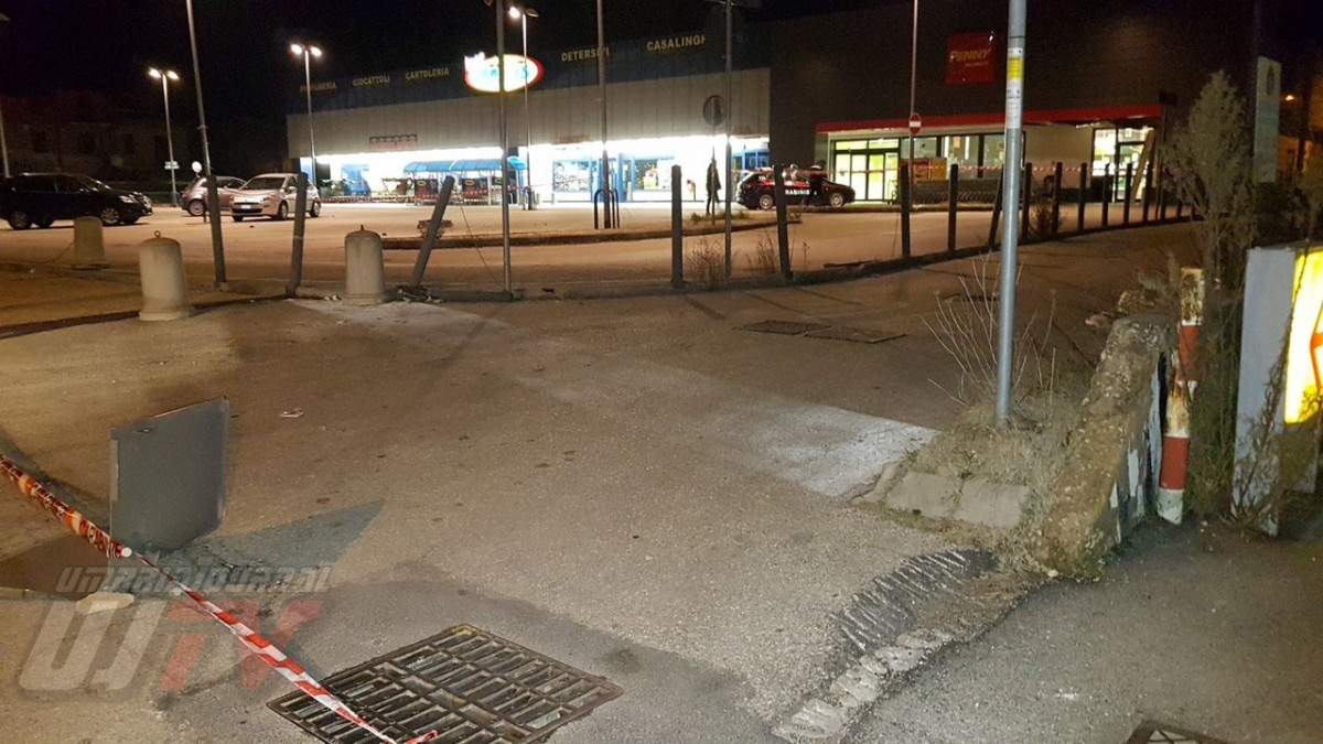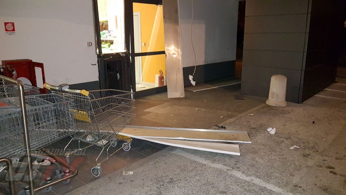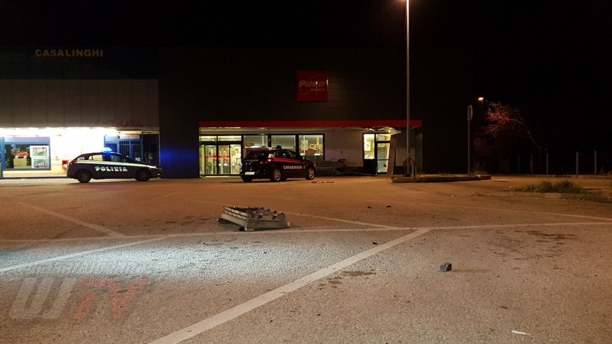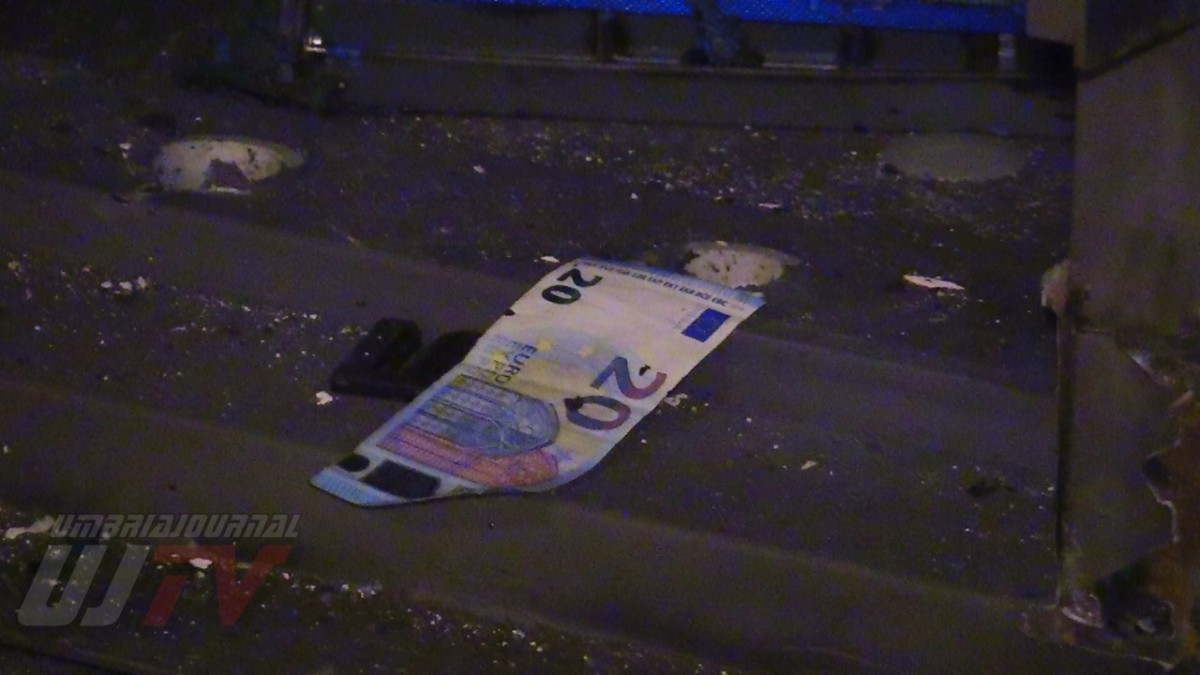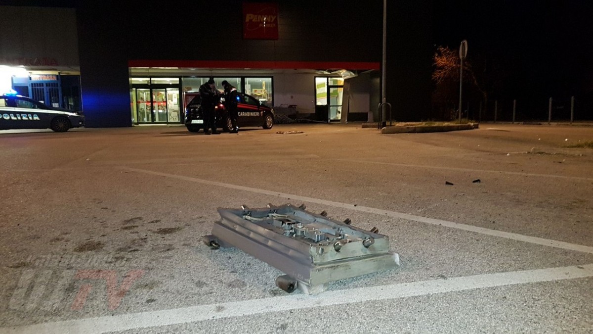Una esplosione pazzesca che ha fatto saltare una parte del coperchio della cassa raggiungendo metà piazzale, a circa 50 metri di distanza. Un altro pezzo di lamiera è finito ancora più lontano quasi nella strada principale, il Viale del Popolo o statale 147 Assisana. Danni all’esterno del Penny, alcune lamiere si sono staccate. Distrutta anche una piccola parte all’interno del supermercato. Vetri e residui di lamiere un po’ ovunque. A terra anche banconote da 20 euro un po’ bruciate.
