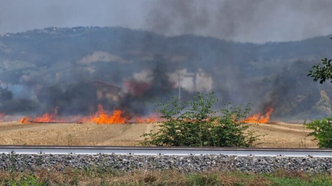 Incendio campo ad Ospedalicchio, fiamme vicino alla linea ferrata