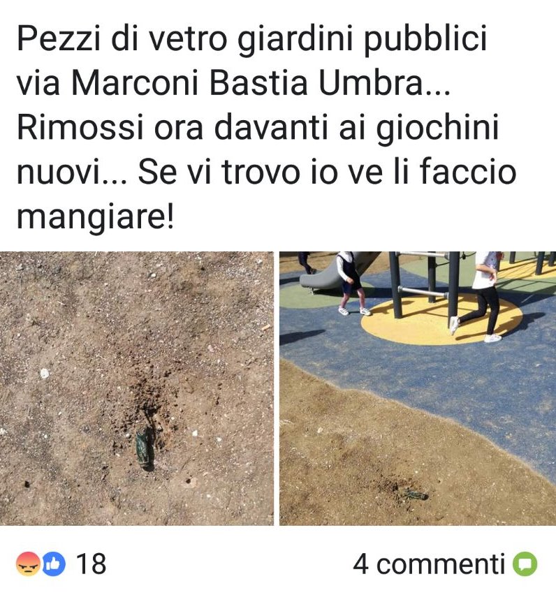 BASTIA UMBRA – «Pezzi di vetro giardini pubblici via Marconi Bastia Umbra… Rimossi ora davanti ai giochini nuovi … Se vi trovo io ve li faccio mangiare!». E’ lo sfogo pubblico su Facebook di un cittadino di Bastia e padre di famiglia, che oggi si è imbattuto in questo orribile spettacolo.