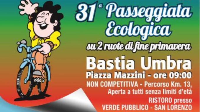 BASTIA UMBRA – La passeggiata ecologica in programma domenica 5 giugno è stata rinviata, causa maltempo, a domenica 12 giugno. La manifestazione prevede il ritrovo e partenza dalla centrale piazza Mazzini alle ore 9. Il percorso di 13 km attraverserà le vie della città e farà una pausa con ristoro in zona San Lorenzo. La manifestazione è aperta a tutti senza limiti di età. Basta avere una semplice bicicletta.