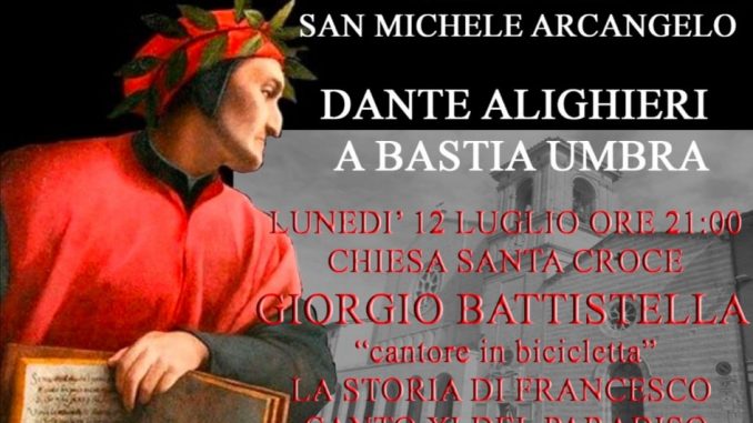 Organizzata dalla Parrocchia di San Michele Arcangelo, lunedì 12 luglio alle ore 21 nella splendida cornice della Chiesa di Santa Croce (Piazza Mazzini – Bastia Umbra) si terrà una serata dantesca con declamazioni tratte dalla Divina Commedia e narrazioni del “cantore in bicicletta” Giorgio Battistella.