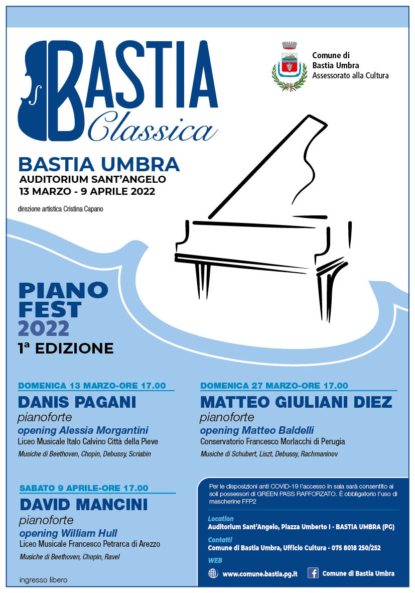 Bastia Classica si propone di portare la musica classica a Bastia Umbra valorizzando per la prima edizione (“Piano Fest” dedicata al pianoforte) presso l’Auditorium S. Angelo. Il desiderio del direttore artistico è quello di valorizzare i giovani musicisti che in questo particolare momento trovano difficoltà ad esprimere la loro arte frutto di anni di studio e sacrifici.
