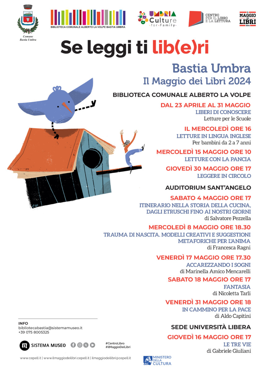 Il Comune di Bastia Umbra e la Biblioteca Comunale “Alberto La Volpe “aderiscono alla campagna nazionale “Il Maggio dei Libri”. Il tema di questa edizione è “Se leggi ti lib(e)ri”.