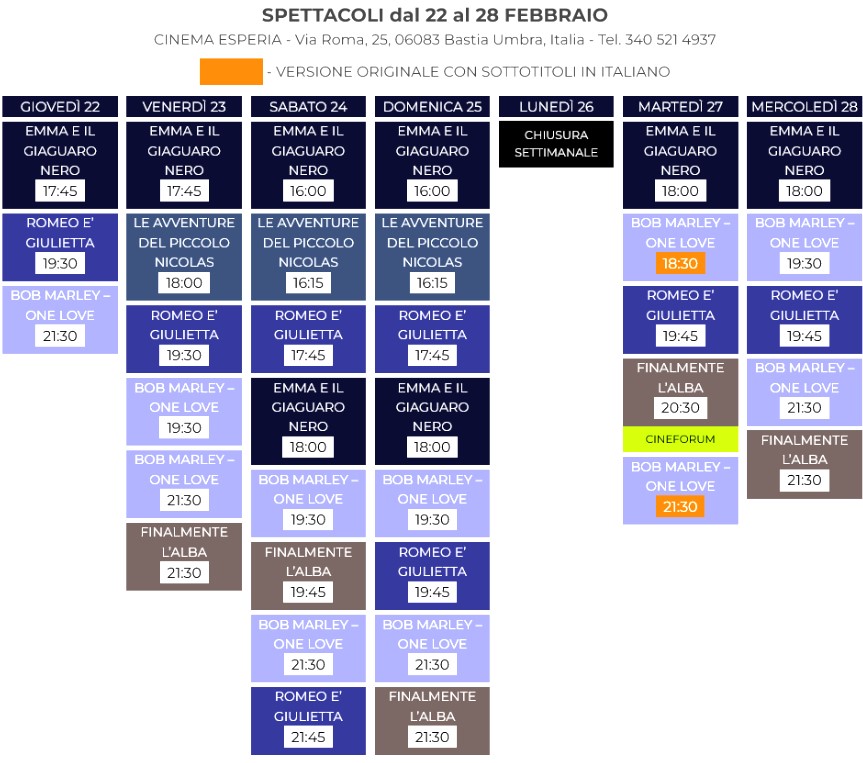 - Bob Marley – One Love: Giovedì 23 Febbraio, ore 19:30 e Sabato 25 Febbraio, ore 22:00.