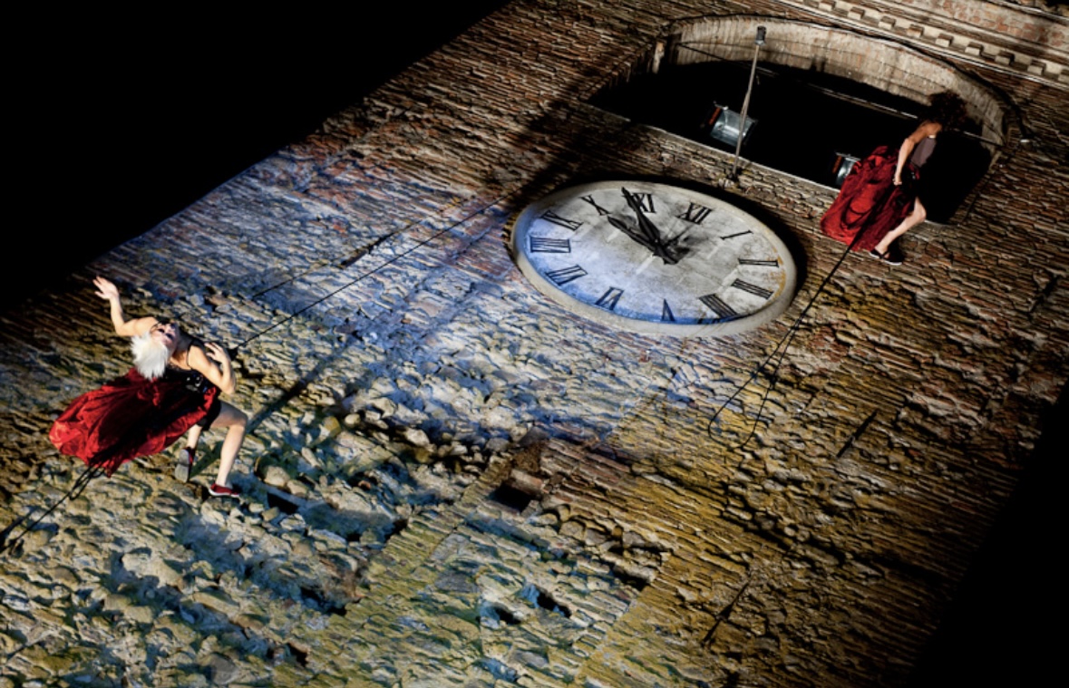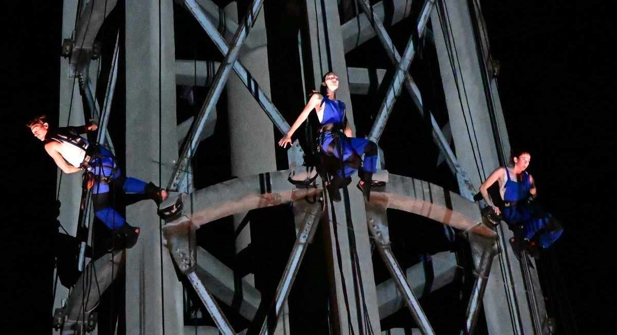 La performance ha visto gli artisti muoversi sospesi sulla superficie verticale del Conservone, eseguendo coreografie aeree accompagnate da musica dal vivo, videoproiezioni e illuminazioni scenografiche. L’intera struttura architettonica è stata trasformata in una tela vivente, restituendo agli spettatori uno sguardo completamente nuovo sul simbolo della città.