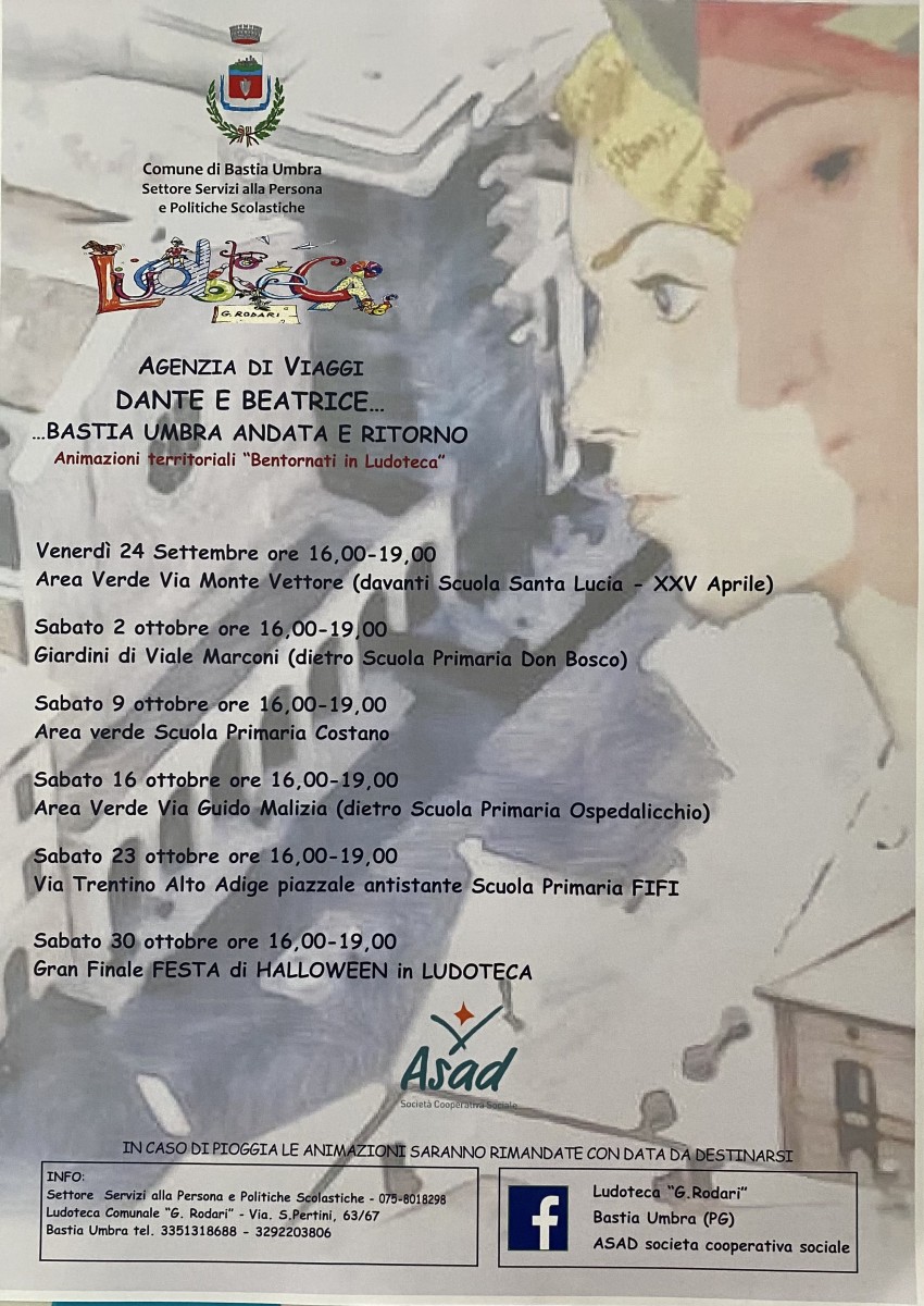 Inoltre a partire dal 24 Settembre e sino al 30 Ottobre saranno realizzate sei animazioni territoriali, ispirate al “Viaggio Dantesco”, che andranno a raggiungere i bambini del Comune di Bastia Umbra, nei loro luoghi di aggregazione naturale: