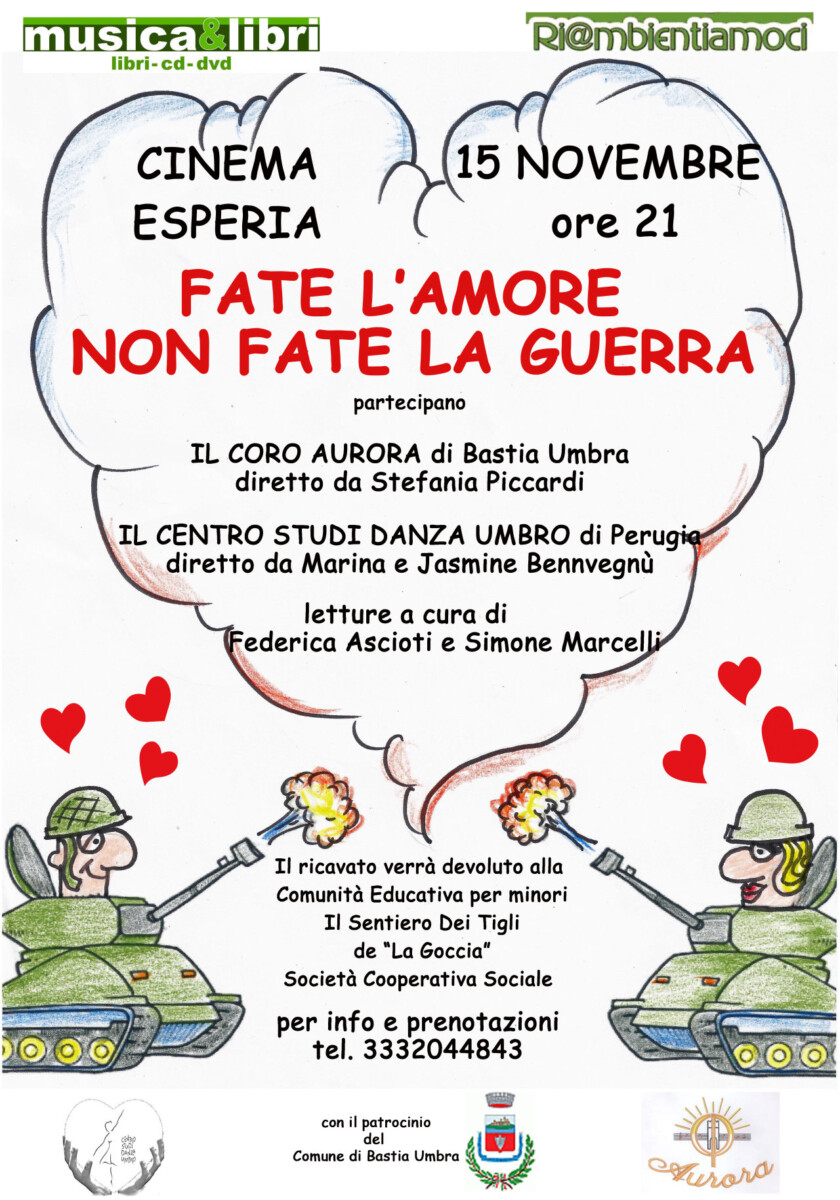 Fate l’amore non fate la guerra con l’associazione Ri@mbientiamoci Giovedì 15 Novembre alle ore 21 l’Associazione “Ri@mbientiamoci” in collaborazione con libreria – Musica&libri presenta: