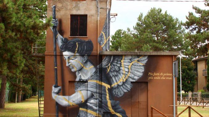 Queste sono le prime parole scritte sulla targa dagli artisti che hanno realizzato un’opera d’arte in Via San Costanzo, un murales dedicato alla popolazione raffigurante il Santo Patrono della città.