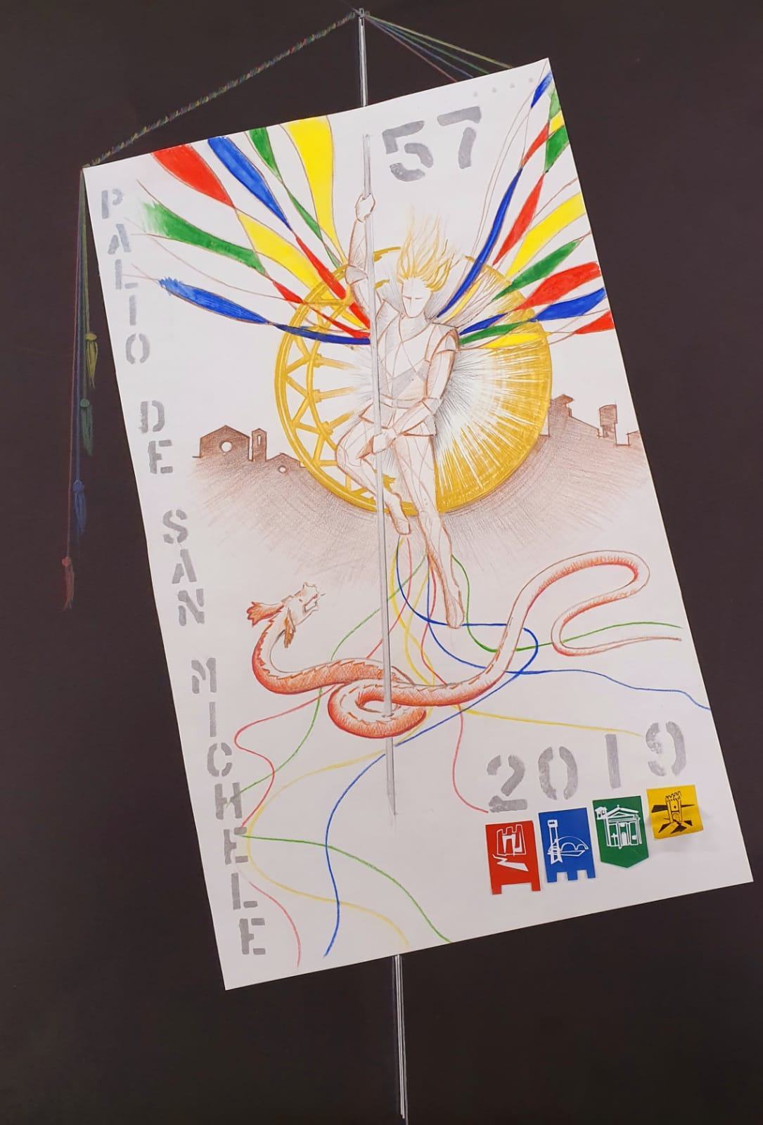 Le ali sono tante linee di luce con i colori dei quattro rioni (blu, giallo, rosso, verde) e hanno origine dal flusso di forze creative popolari, rappresentate dalle linee colorate in basso. Alle spalle di San Michele si intravede la città di Bastia Umbra con alcuni dei monumenti più rappresentativi: le Chiese di San Michele e Santa Croce, lo stabilimento Petrini e il Conservone. Al centro si stagli il rosone che per metà richiama le forme geometriche di quello della Chiesa del Patrono, mentre per metà il disco solare, simbolo dell’Arcangelo che veglia sulla città. L’asta dello stendardo emerge fisicamente nel piano figurativo dandogli tridimensionalità e tracciando la dinamica traiettoria verticale della discesa dell’angelo. Sul lato sinistro la scritta “Palio de San Michele”, in alto il 57° dell’edizione e in basso l’anno 2019 con gli stendardi dei quattro rioni in ordine alfabetico.