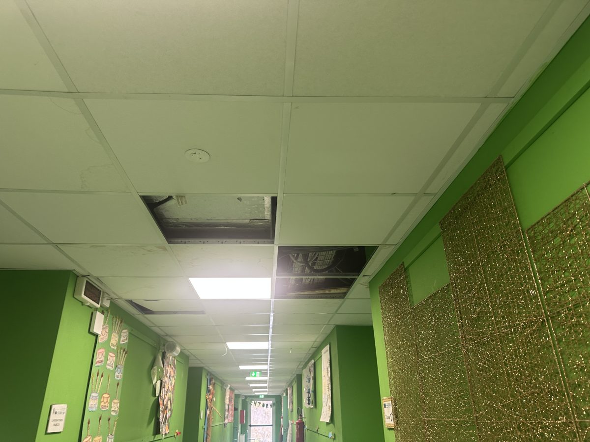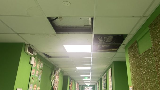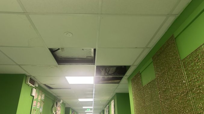 Le infiltrazioni d’acqua dal tetto aggravano ulteriormente la situazione. Nei giorni di pioggia, l’acqua si riversa nei corridoi, rendendo i pavimenti scivolosi e pericolosi. Anche i tendaggi delle aule, mai sottoposti a lavaggio, risultano impolverati e in cattivo stato, contribuendo a un ambiente poco salubre.