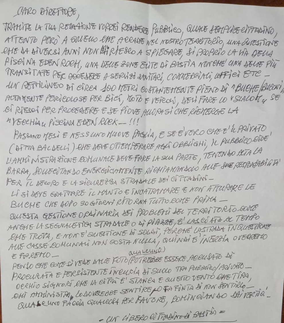 E per finire conclude la lettera firmata dal libero cittadino di Bastia