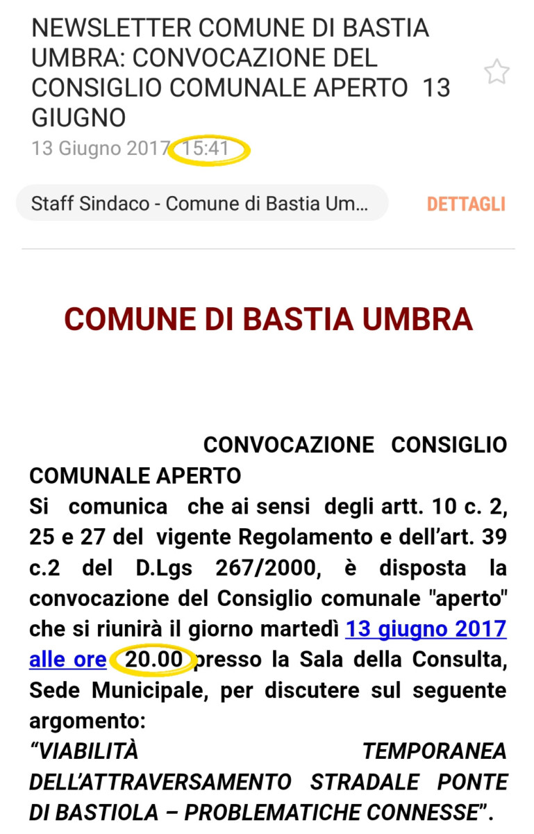 BASTIA UMBRA – L’avviso di convocazione del Consiglio Comunale del 13 giugno 2017 alle ore 20 è stato comunicato alla cittadinanza via mail alle ore 15,42: vale a dire poco più di quattro ore prima dell’inizio dell’evento.
