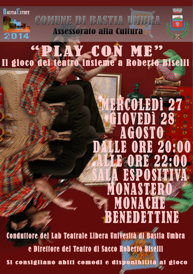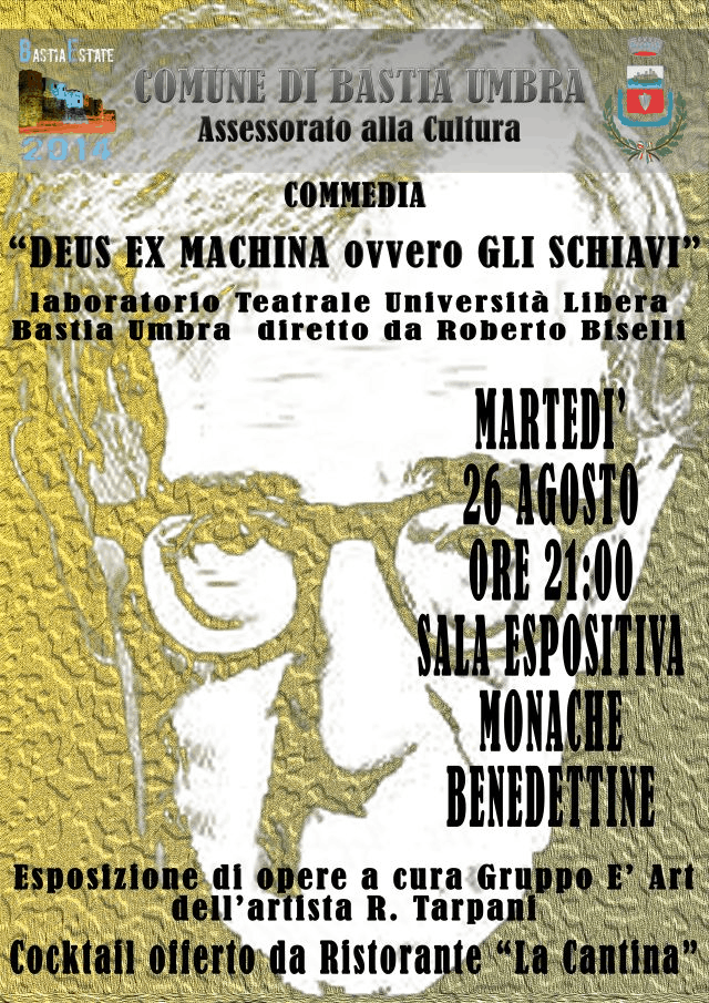 BASTIA UMBRA – Nell’ambito della Rassegna Bastia Estate 2014, previsti tre giorni interamente dedicati al Teatro. Il primo appuntamento è quello di Martedì 26 Agosto, ore 21:00, presso la Sala Espositiva del Monastero delle Monache Benedettine, con lo spettacolo teatrale “Deus ex machina, ovvero gli schiavi”, messo in scena dal Laboratorio Teatrale della Libera Università di Bastia Umbra, diretto da Roberto Biselli e tratto da una brillante commedia del grande Woody Allen.