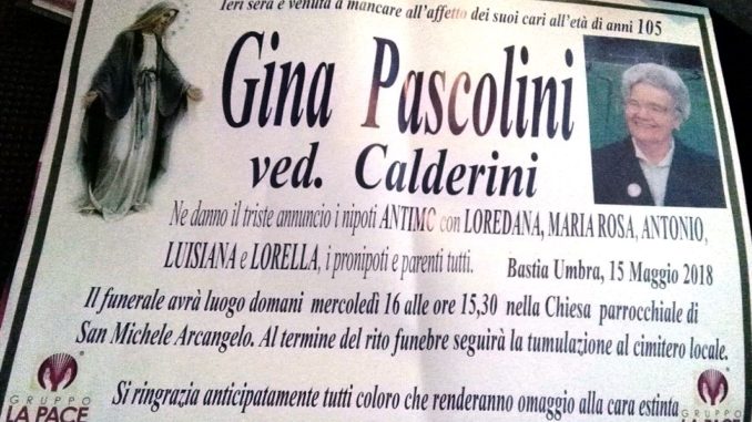 Bastia Umbra perde una ultra centenaria, è Gina Pascolini BASTIA UMBRA – Bastia perde una ultra centenaria. La signora Gina Pascolini, vedova Calderini, è venuta a mancare ieri all’affetto dei suoi cari all’età di 105 anni.