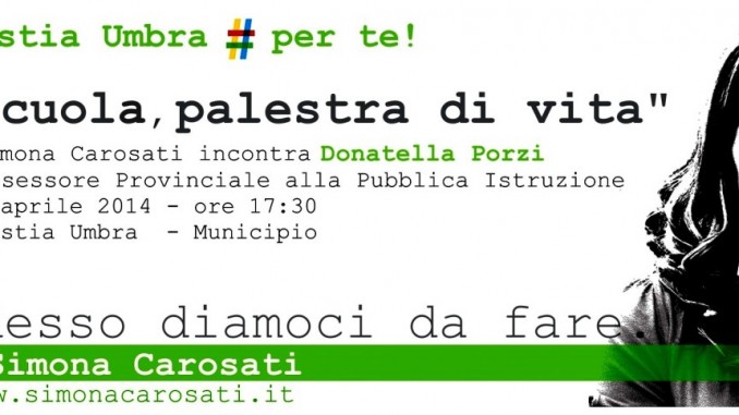 Venerdì 4 Aprile alle ore 17.30, presso il Municipio di Bastia Umbra, Simona Carosati incontrerà Donatella Porzi, Assessore della Provincia di Perugia con deleghe alle Pubblica istruzione e Formazione integrata, Attività culturali e sociali, Politiche giovanili, Politiche comunitarie e programmazione negoziata e Pari Opportunità.