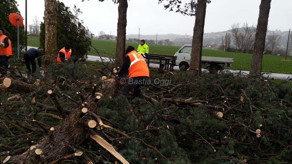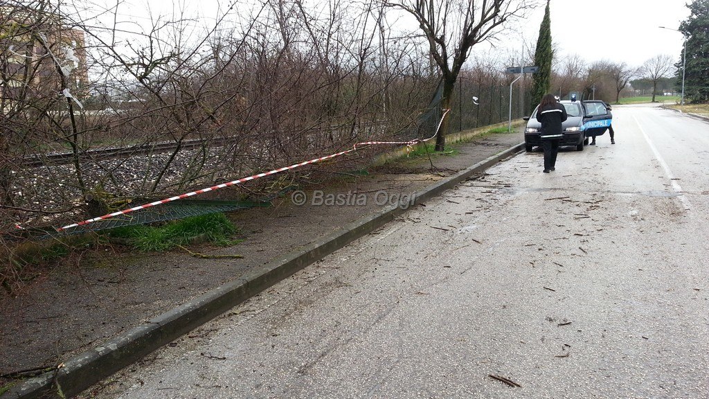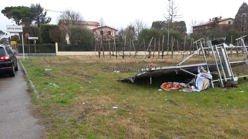 Oltre all’Alto Tevere, anche l’assisano, la zona di Bastia Umbra per piante e rami caduti. Capovolto all’ingresso di Bastia un carrello pubblicitario. Sempre a Bastia nei pressi del Giontella, il forte vento ha spezzato anche la rete nella strada rasente la linea ferroviaria. Molti alberi abbattuti, rami, cornicioni di case private, alcuni segnali stradali divelti, cassonetti rovesciati. Le vie interessate – riferiscono dal comando della Polizia Municipale di Bastia – sono Via Allende, Via San Rocco, Via Roma, Via San Valentino, Via Firenze, Via della Repubblica. Il tutto si è concentrato al centro di Bastia Umbra, nessun danno, al momento nelle frazioni.