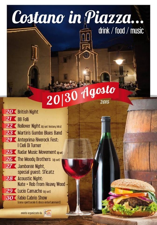E’ la Sagra della Porchetta, organizzata dal Gruppo Giovanile di Costano. 42 anni di vita, frutto di una forte unione che ogni anno si rafforza sempre di più. Il programma di quest’anno è ricco, così come gli anni precedenti. «Torna a rivivere, dopo una lunghissima assenza, il Centro Storico del nostro Paese – ha detto Michela Migliosi, presidente del Gruppo Giovanile di Costano -. Nasce “Costano in piazza…Drink & Food” – aggiunge -, un’invenzione del tutto originale ed innovativa. Nella splendida cornice della piazza del paese – ha spiegato la presidente – oltre ad una ricercata selezione musicale con le migliori live band regionali intervallate da dj set dalla sonorità deep e chill out, la piazza nel corso delle undici serate sarà luogo di aperitivi dove poter degustare ottimi vini e birre ricercate. Il tutto accompagnato da assaggi di porchetta, ed altre specialità tra cui il nuovissimo “Pig Burger”, elaborato e creato secondo gli attuali concetti di Street Food, ovviamente rivisitato in stile del tutto costanese e che farà parlare di se per la sua particolarità».