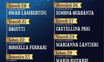 Ma non è solo questo…è anche ‘Musica sotto le stelle’ con Omar Lambertini, Orchestra Italiana Bagutti, Rossella Ferrari e i Casanova, Orchestra Spettacolo Vincenzi-Fans Club Ufficiale, Daniele Tarantino, Matteo Tassi, Orchestra, Simona Quaranta, Orchestra Castellina Pasi, Orchestra Marianna Lanteri, Orchestra Mario Riccardi, Claudia e l’orchestra italiana.