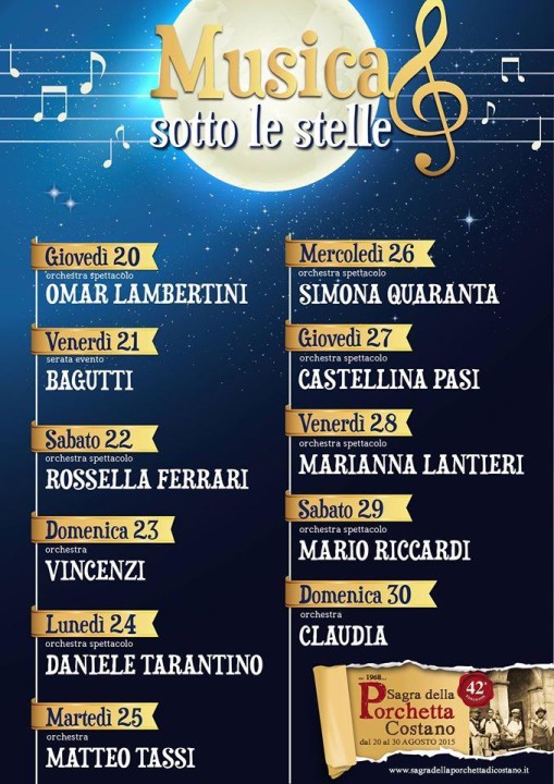 La sagra della Porchetta di Costano vi aspetta dal 20 al 30 agosto 2015 per 11 giorni di pieno relax. Tutte le sere a partire dalle ore 18 fino a tarda notte. Solo vivendola si potrà capire quanto di speciale ha la Sagra della Porchetta di Costano.