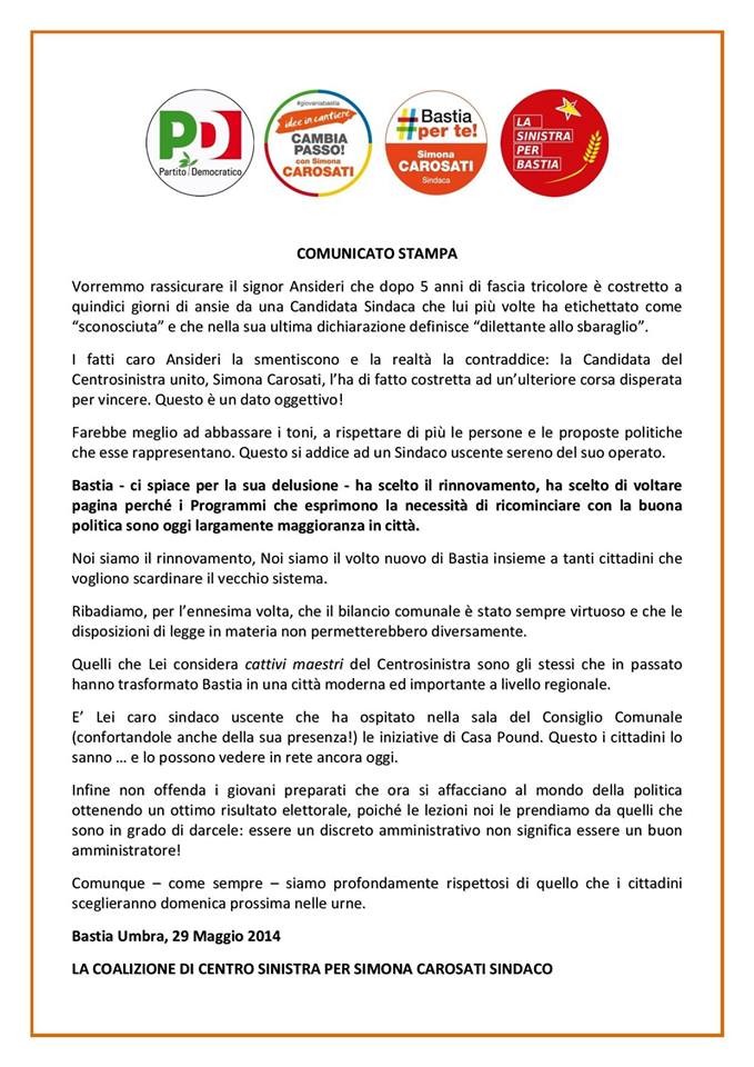 Il Risultato Elettorale Amministrativo del Comune di Bastia Umbra ha bocciato la riconferma del Sindaco Ansideri. Le sue certezze di vittoria al primo turno sono clamorosamente fallite. Dal risultato elettorale emerge che le forze del rinnovamento e della partecipazione sono nettamente maggioranza….Un grazie di cuore ai 174 elettori che hanno espresso la loro preferenza per me. E grazie anche a tutti coloro che, a prescindere dalla preferenza espressa, hanno votato Simona Carosati. Vi chiedo a tutti di continuare a sostenere il nostro progetto amministrativo estremamente valido nella direzione del rinnovamento, della crescita, dell’onestà e della trasparenza. L’8 giugno dobbiamo andare tutti a votare Simona Carosati con la certezza di sostenere la politica che ha messo dinanzi a tutto l’etica, le idee e la competenza. Punti e cardini sulle quali la nostra Candidata ha tanto puntato! Ancora grazie.