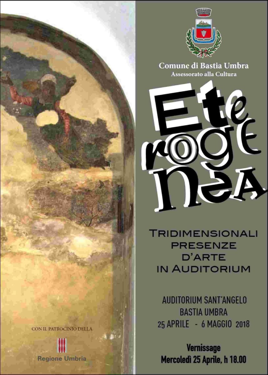 BASTIA UMBRA – Si svolgerà a Bastia Umbra, dal 25 Aprile al 6 Maggio 2018, con Vernissage Mercoledì 25 aprile, ore 18, la Mostra ETEROGENEA, una collezione di opere “dal figurativo all’astratto, dal concettuale al ready – made, dove gli autori si sono cimentati, oltre che con i materiali classici della scultura come il bronzo, il legno, la terracotta, il cemento, la ceramica ed il ferro, anche con materiali meno tradizionali quali il polistirolo, la stoffa e, persino il cioccolato” (dalla Introduzione alla Mostra, del curatore Giorgio Croce).