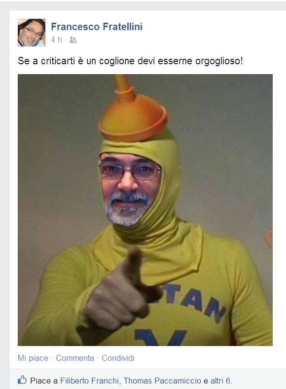 La critica non è sfuggita certo a Francesco Fratellini che, bel bello, si è conciato come vede nella foto. Tuta gialla, scritta come quella dell’eroe di Striscia La Notizia, e “stura lavandino” (sturalavello) in testa. Non manca certo l’indice puntato. Il vice “Alcalde” scrive sul suo profilo Facebook: “Se a criticarti è un coglione devi esserne orgoglioso!”.