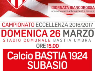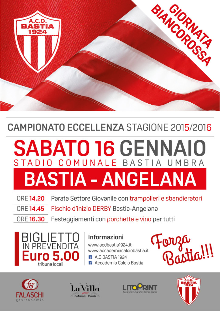 BASTIA UMBRA – Sabato 16 gennaio 2016, in occasione del “derby” Acd Bastia 1924 e Angelana, la società sportiva, del presidente Sandro Mammoli, ha deciso di organizzare la “Giornata Biancorossa”. La manifestazione comincerà, più o meno, a ridosso dell’inizio della partita di calcio che si disputerà a partire dalle 14,45, la festa, invece, avrà inizio alle 14,20.