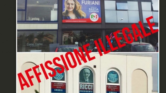 Il M5S di Bastia Umbra rende noto di avere presentato oggi al Comando della Polizia Municipale, una richiesta di intervento a tutela degli spazi elettorali destinati all’affissione dei manifesti propagandistici elettorali. Rispettivamente la candidata PD Ramona Furiani ed il candidato presidente Claudio Ricci hanno affisso fuori degli spazi assegnati e consentiti, delle enormi vetrofanie ben visibili dalla antistante SS75 Centrale Umbra, esponendo in maniera evidente i nomi dei candidati e le loro immagini, al fine evidente di intercettare ed orientare potenziali elettori.