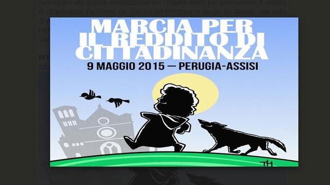 “La Repubblica riconosce a tutti i cittadini il diritto al lavoro e promuove le condizioni che rendano effettivo questo diritto”. Il reddito di cittadinanza vuole trasformare questo articolo della nostra Costituzione in una reale prospettiva per i cittadini: un reddito minimo di 780 euro mensili garantito a tutti i cittadini senza lavoro, previa iscrizione obbligatoria alle liste di collocamento e l’impegno ad avviare un percorso di formazione professionale qualificante, oltre alla necessità di dover svolgere almeno 8 ore settimanali di lavori socialmente utili nel proprio comune, con decadenza del diritto alla terza offerta di lavoro rifiutata. Le coperture finanziarie necessarie a tale rivoluzionario provvedimento sono già state individuale e certificate dalla Corte dei Conti, manca solo la volontà politica di porre in atto questo importantissimo strumento di welfare affinche, anche nel nostro paese, il lavoro sia una prospettiva reale e non una lontana chimera, spesso oggetto di ricatto e di vessazione, in mano a spietate multinazionali o a vari potentati politico-mafiosi. Scendi anche Tu in piazza e fai sentire la Tua voce, per ottenere un diritto di molti contro i privilegi di pochi! Ti aspettiamo a Perugia il 9 maggio 2015 per partecipare alla grande mobilitazione dei cittadini liberi, per promuovere il reddito di cittadinanza! Partiremo dai Giardini del Frontone in Borgo XX Giugno, alla volta di Assisi, Santa Maria degli Angeli, con destinazione finale in via Patrono d’Italia. Parteciperanno alla marcia molti parlamentari M5S oltre a Beppe Grillo e Gianroberto Casaleggio. Non mancate!