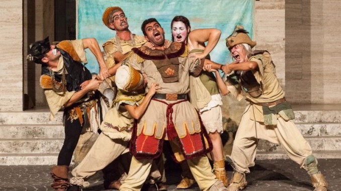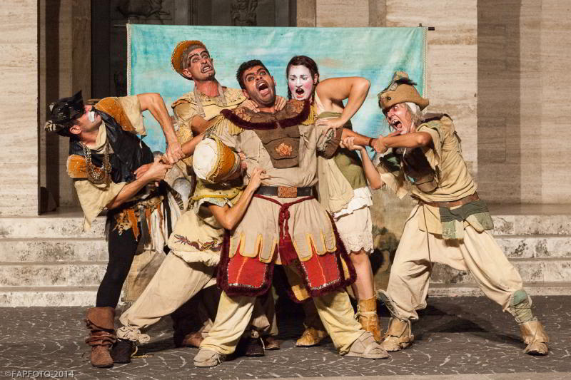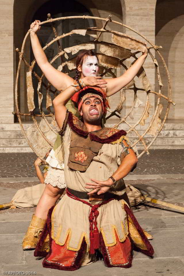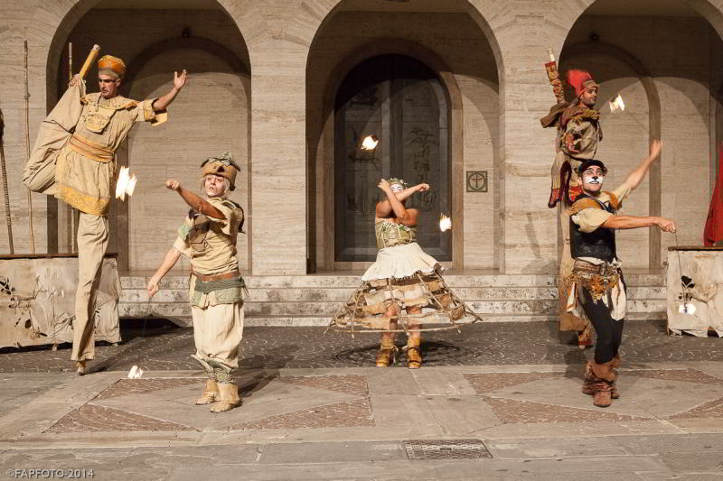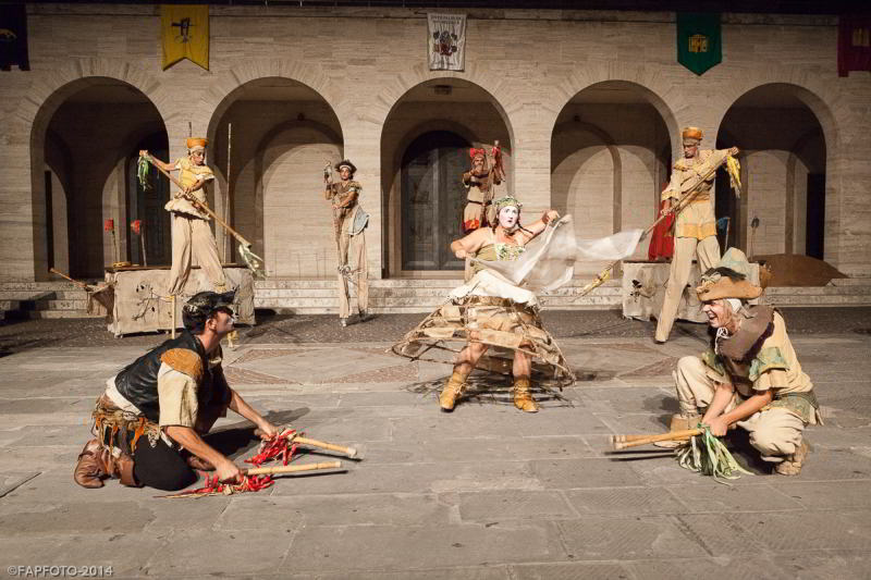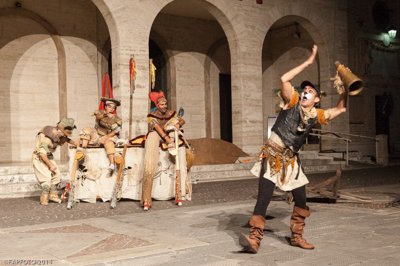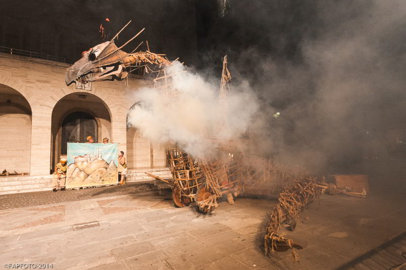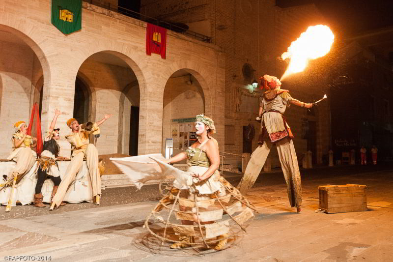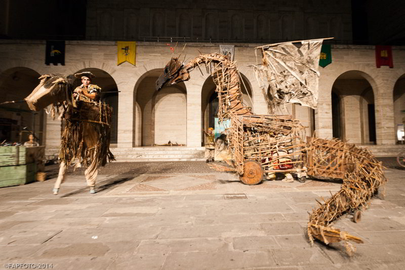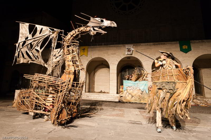 Venerdì 19 settembre Piazza Mazzini ha ospitato “Draaago”, lo spettacolo teatrale della Compagnia Teatro dei Venti. Atmosfere fiabesche ed infernali tra bastoni infuocati, maschere, trampoli, sputafuoco e un Drago alto 5 metri. Scenografie mobili e cavalli rachitici davanti ad un pubblico appassionato e coinvolto, nello scenario che da questa sera, 21 settembre, ospiterà le sfilate dei 4 rioni.