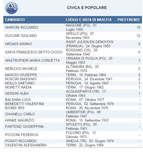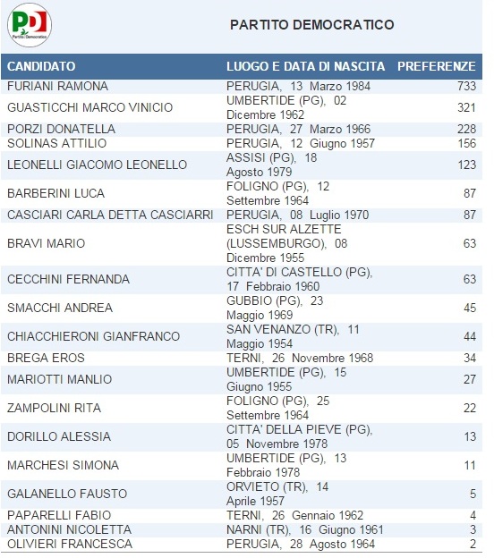 – Partito Democratico: al primo posto vede la bastiola Ramona Furiani che ha avuto 733 voti, seguita da Marco Guasticchi con 321 e da Donatella Porzi con 228, Attilio Solinas 156, Giacomo Leonelli 123, tutti gli candidati non hanno superato il 100.