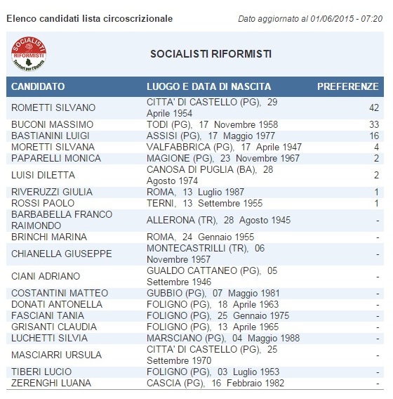 – Socialisti Riformisti: al primo posto Silvano Rometti con 42 voti, Massimo Buconi 33, Luigi Bastianini 16, Silvana Moretti 4, Monica Paparelli 2, Diletta Luisi 2, un voto per Giulia Riveruzzi e Paolo Rossi, tutti gli altri non hanno ottenuto alcun voto.