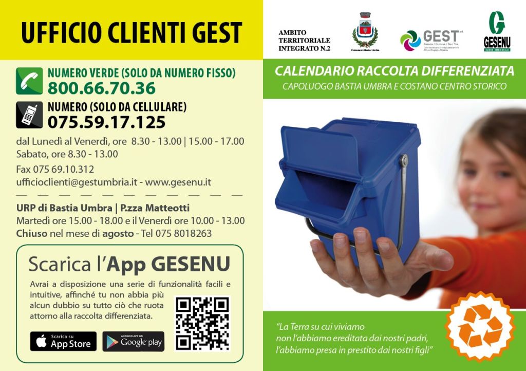 Tutti gli appuntamenti verranno comunicati tramite volantinaggio, notifiche APP, pubbliche affissioni. Bastia Umbra è un luogo di buone prassi da prendere a modello, come ha sottolineato il direttore di Gsa Gruppo Gesenu Sonia Rotini, illustrando la campagna di comunicazione ideata per il nuovo piano di raccolta: “anche la raccolta del vetro rappresenta un altro punto di eccellenza. Non esistono più campane stradali e l’atteggiamento virtuoso dei residenti dediti alla raccolta di questo materiale consente di implementare la qualità in questa filiera. La campagna di comunicazione verterà a promuovere comportamenti corretti per i quali verranno previsti altrettanti percorsi premianti”. Rimane un punto fermo per la cittadinanza l’ufficio clienti Gest al quale potersi sempre rivolgere ufficioclienti@gestumbria.it; 800.66.70.36 da numero fisso e 075.59.17.125 da cellulare. Ed inoltre: URP di Bastia Umbra, P.zza Matteotti, martedì ore 15.00 – 18.00, Venerdì ore 10.00 – 13.00, 075 8018263 Le assemblee territoriali programmate per Aprile, alle ore 21,00, sono le seguenti: Giovedì 9 – Centro San Bartolo, Via San Bartolo; Martedì 14 – Centro Sociale Campiglione, Via della Libertà; Venerdì 17 – Circolo Arci Nova Cipresso, Via Sofia; Mercoledì 22 – Centro Culturale Ricreativo, Via della Resistenza; Martedì 28 – Centro Sociale Costano I mastelli per la zona poker potranno essere ritirati nei seguenti giorni, dalle 14,00 alle 19,00 7 – 8 – 9 – 10 Maggio – Centro San Bartolo, Via San Bartolo; 14 – 15 – 16 – 17 Maggio – Centro Sociale Campiglione, Via della Libertà; 21 – 22 – 23 – 24 Maggio – Circolo Arci Nova Cipresso, Via Sofia; 28 – 29 – 30 – 31 Maggio Centro Culturale Ricreativo, Via della Resistenza, Ospedalicchio; 4 (dalle 17,00) – 5 – 6 – 7 Giugno – Centro Sociale Costano.