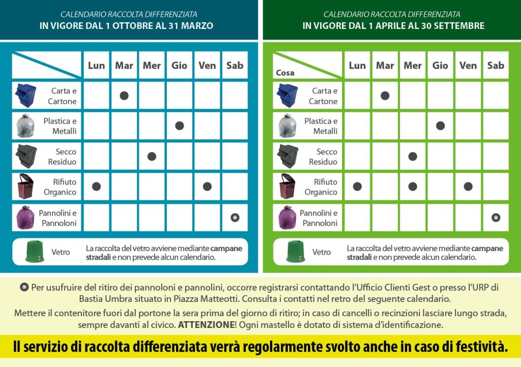 A partire dalla metà di Aprile sarà attuata una campagna informativa su dove reperire i nuovi calendari ed i vademecum, ovvero le guide pratiche per conoscere in dettaglio norme e finalità della FOU ed altre tipologie di raccolta quale quella di pannolini e pannoloni. Per questi ultimi verrà previsto un servizio su prenotazione per il ritiro di particolari quantità prodotte, anche a tempo determinato e con giorno dedicato in calendario, attualmente il sabato, conferite in appositi sacchi viola consegnati allo scopo alle singole utenze che ne facciano richiesta. L’esperienza positiva dell’utilizzo dei mastelli a Bastia Umbra, per molti aspetti pilota a livello nazionale, induce a puntare oltremodo su tale metodologia per raggiungere maggiore quantità e qualità di raccolta differenziata.