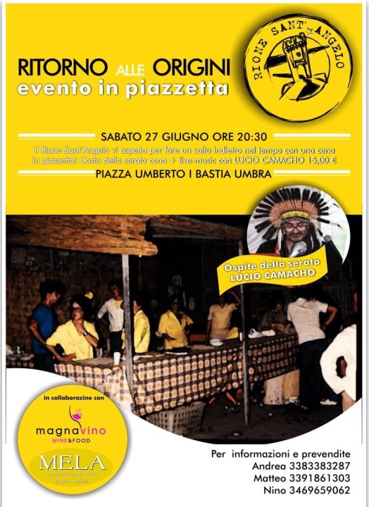 Sabato 27 giugno 2015, alle ore 20,30, in piazza Umberto I a Bastia Umbra, “Ritorno alle origini”. Il Rione San’Angelo, dove il tutto è cominciato con una cena n collaborazione con il ristorante “Magnavino Bastia” e “Mela Pasticceria” al corso di 15 euro bevande incluse, ha letteralmente ridato vita a quella che, anticamente, era la vera piazza della Città: “Umberto I”. Musica con grande dj Lucio Camacho davanti alla suggestiva facciata della Chiesa di Sant’Angelo. “Bellissimo – scrive su facebook l’ex responsabile dell’ufficio cultura del Comune, Clotilde Ceccomori – vedere il centro storico così vivo e con questa allegria! Bravi gli organizzatori!” . Paolo Meli sul suo profilo scrive, invece, «Ieri sera il nostro capitano Michele Lombardi, mi ha chiesto, ” sarà riuscita bene?» La mia risposta è stata: “Michele, cos’è che non ci riesce??”. Il capitano è quello de Rione Sant’Angelo che, con Ritorno alle origini (speriamo si faccia tutti gli anni), ha ridato vita a questo splendido angolo di Bastia Umbra.