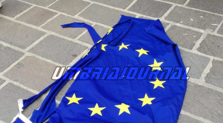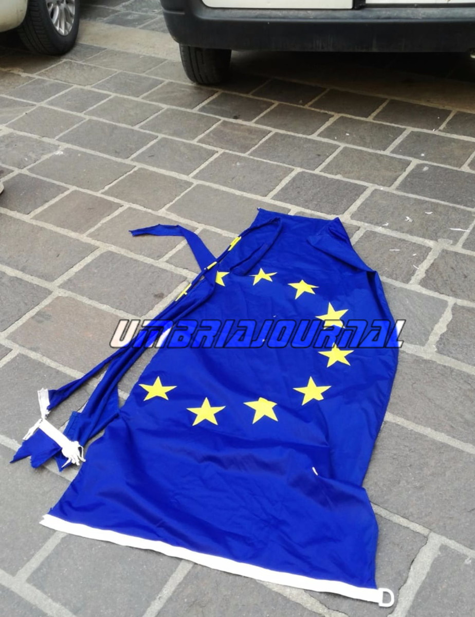 Strappate le bandiere dell’Europa dai palazzi del Comune di Bastia Umbra «Certo che tenere issata nelle sedi istituzionali italiane la bandiera dei dittatori europei è uno schifo…io la mia parte l’ho fatta…in comune a Bastia Umbra l’europa non è più rappresentata dalla bandiera che ho personalmente strappato e consegnato ai carabinieri di Bastia dove mi sono costituito…chiedo scusa alla collettività per il danno economico arrecato e sono pronto a risarcire sperando che i soldi siano utilizzati per fare una nuova bandiera italiana e non quel simbolo di sofferenza morte e povertà…viva l’italia». Sono le parole che riportiamo, volutamente con tanto di mancate maiuscole, estrapolate dal profilo di una persona che ha deciso di inscenare la sua protesta contro l’Europa unita e contro gli europeisti.