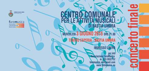 L’Associazione Culturale Musicale FareMusica terrà Mercoledì 3 Giugno 2015 alle ore 21 presso il Teatro Esperia di Bastia Umbra il Concerto Finale dell’Anno Accademico 2014-2015 del Centro Comunale per le Attività Musicali del Comune di Bastia Umbra.