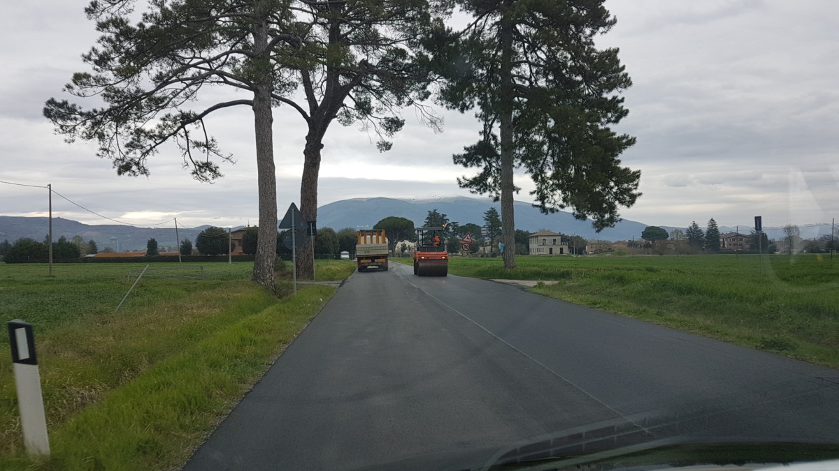 No, non ci crediamo ancora eh! Imbocchiamo la strada Statale – che di Statale non ha più che il nome – 147 “Assisana” e…ma no, dai, non ci possiamo credere: asfaltano. E presi, come dire, da una certa frenesia chiamiamo per sapere se sarà bitumato tutto il tratto oppure una parte. Vorremmo sapere se sarà asfaltato tutto il tratto che va dalla fine di Bastiola alla rotatoria di Ospedalicchio sud, oppure.