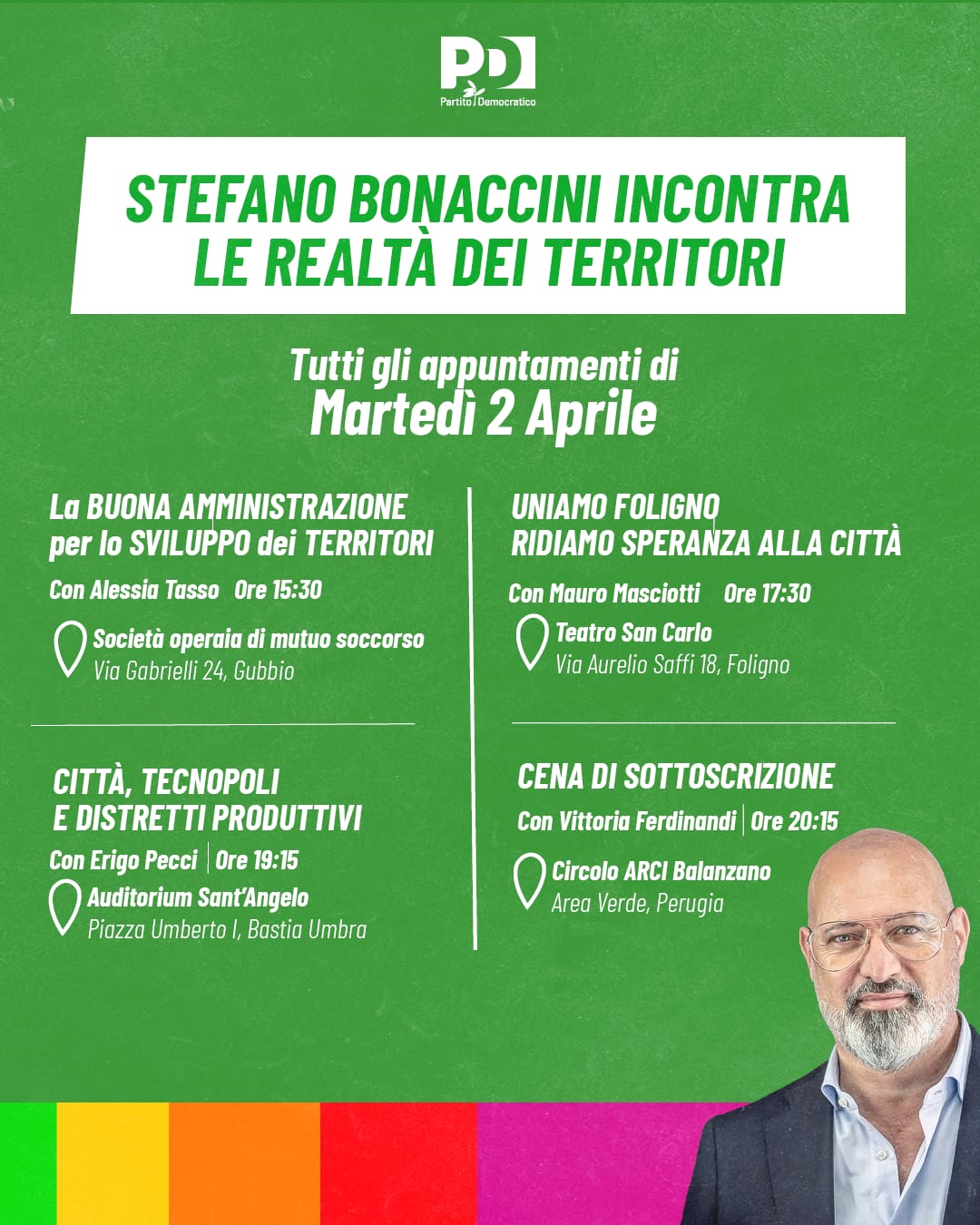 Stefano Bonaccini, il Presidente della Regione Emilia Romagna, si prepara per un tour di due giorni in Umbria, con dodici appuntamenti programmati da martedì 2 Aprile. Il tour, che coprirà diverse città da Gubbio a Foligno, passando per Perugia, Bastia, il comprensorio del Trasimeno fino all’Alto Tevere, è un segno del suo autentico e sentito attaccamento alla regione.