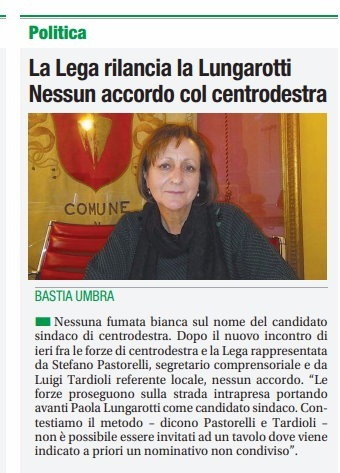 BASTIA UMBRA Il Centrodestra che a Bastia sostiene Ansideri, tiene alla correttezza e alla chiarezza e quindi in merito alla dichiarazione uscita su un quotidiano locale da parte dei rappresentanti del comprensorio della Lega, segnala che non corrisponde a verità quanto affermato.Infatti all’incontro è stato chiesto di proporre uno o più nomi alternativi al nostro, con l’impegno che una volta verificato il gradimento della città (anche eventualmente con un sondaggio commissionato ad una primaria società demoscopica) ci saremmo dovuti rivedere per valutare insieme la scelta migliore per Bastia.