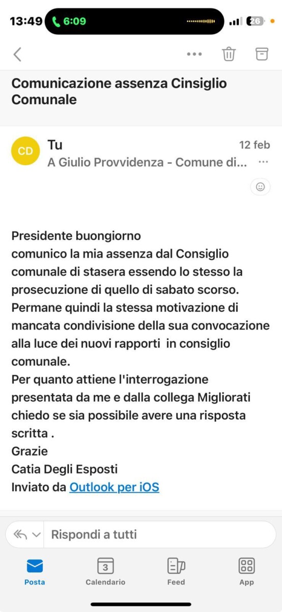 L’assessore Santoni asserisce che la nostra richiesta di risposta scritta non sia stata avanzata in modo formale sbagliando anche in questo! Infatti in data 12/02/2023 il Consigliere Degli Esposti comunica a mezzo mail l’assenza al Consiglio Comunale e avanza formale richiesta di risposta scritta all’interrogazione presentata. (Come da foto sotto).