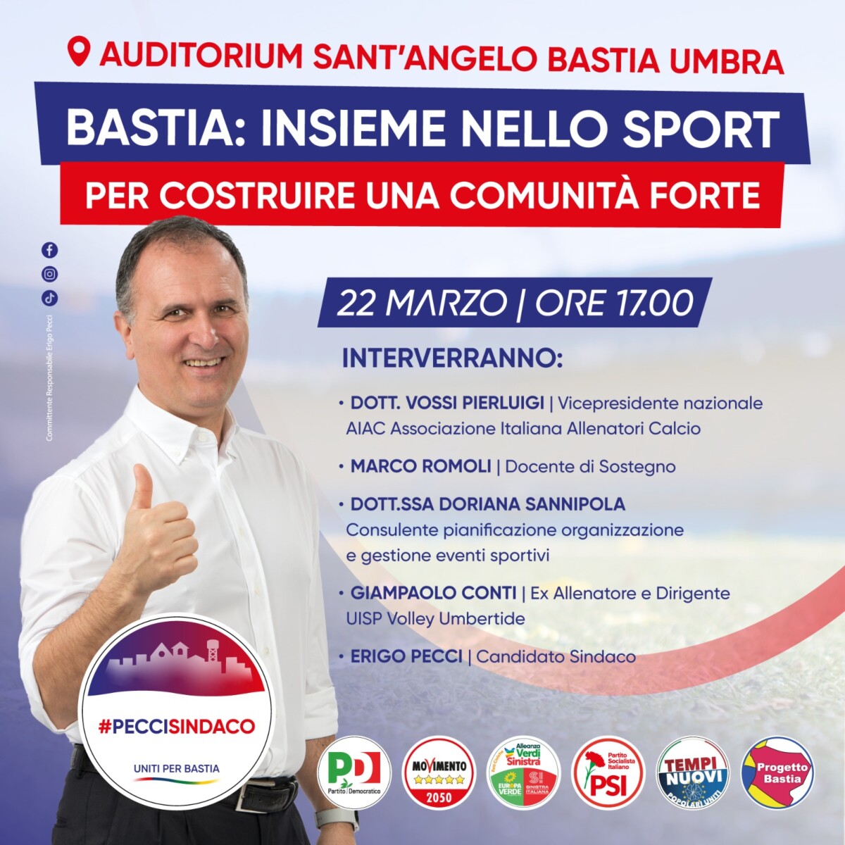 La Coalizione Civico Progressista di Bastia ha organizzato l’evento “Bastia: Insieme nello Sport”, un’occasione unica per celebrare il potere trasformativo dello sport nella nostra comunità. Nell’incontro, che si terrà venerdì 22 marzo all’Auditorium Sant’Angelo, alle ore 17, parteciperanno illustri ospiti, tra cui il Dott. Vossi Pierluigi, Vicepresidente nazionale dell’Associazione Italiana Allenatori Calcio (AIAC), Marco Romoli ex calciatore docente di sostegno, Dott.ssa Doriana Sannipola, esperta in pianificazione, organizzazione e gestione di eventi sportivi, Giampaolo Conti, Ex Allenatore e dirigente UISP Volley Umbertide e Erigo Pecci, Candidato Sindaco.