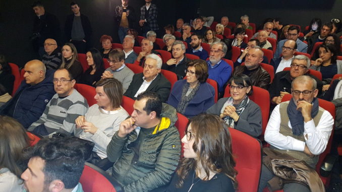 La sala piccola del Cinema teatro Esperia riempita totalmente. Forse la Coalizione temeva di non avere sufficienti presenze per riempire la grande sala del cinematografo della città. Vi possiamo garantire che fuori ci saranno state almeno altre duecento persone che sono circolate, lamentando il fatto che non cera posto. Settanta all’interno, un paio di cento – cifra più cifra meno -, e la sala grande – decisamente più comoda, e adeguata alle tante persone che avrebbero potuto partecipare all’incontro.