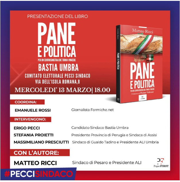 Matteo Ricci, sindaco di Pesaro e presidente di ALI Nazionale (Autonomie Locali Italiane), sarà a Bastia Umbra mercoledì 13 marzo per presentare il suo libro “Pane e politica”.