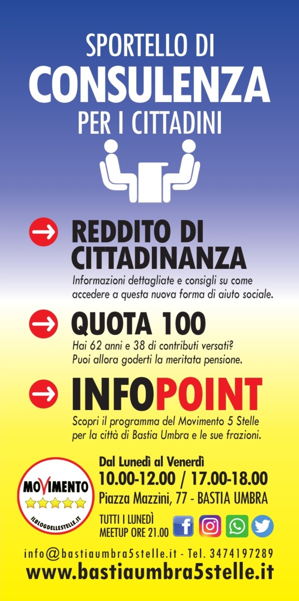 Presso la Sede Elettorale del MoVimento 5 Stelle di Bastia Umbra è in funzione lo Sportello di Consulenza per i cittadini per fornire gratuitamente informazioni ed orientamento sulle misure recentemente introdotte dal Governo ed in particolare il Reddito di Cittadinanza e Quota 100.