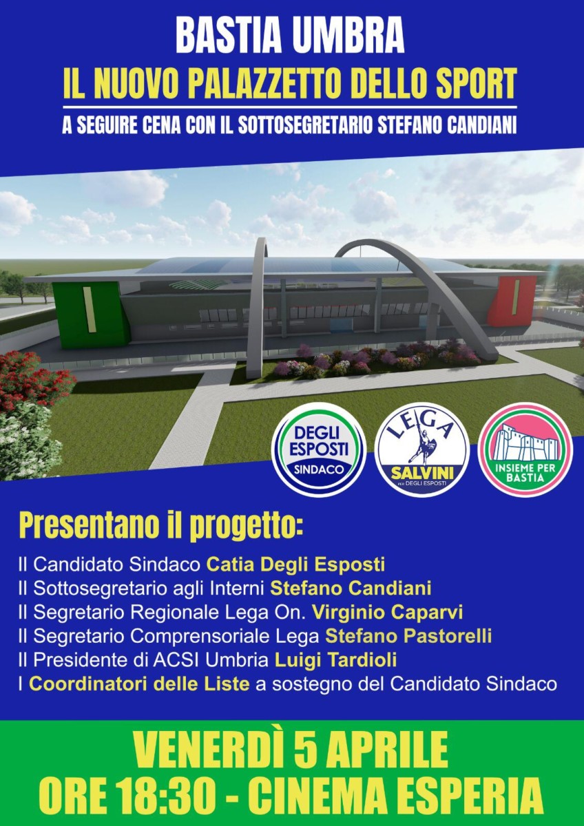 Venerdì 5 aprile, alle ore 18:30, presso il Cinema Esperia, sarà presentato il progetto del nuovo Palazzetto dello sport da realizzarsi nella grande area che già comprende la piscina comunale coperta. Presenteranno l’opera il candidato a sindaco Catia Degli Esposti, il sottosegretario agli Interni Stefano Candiani, l’on. Virginio Caparvi segretario regionale della Lega, Stefano Pastorelli segretario comprensoriale della Lega, Luigi Tardioli presidente di ACSI Umbria, i coordinatori delle liste a sostegno del candidato sindaco.
