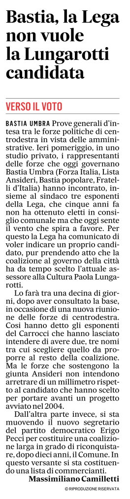 «Ieri pomeriggio – scrive il Messaggero Umbria -, in uno studio privato, i rappresentanti delle forze che oggi governano Bastia Umbra (Forza Italia, Lista Ansideri, Bastia popolare, Fratelli d’Italia) hanno incontrato, insieme al sindaco tre esponenti della Lega. Per questo la Lega ha comunicato di voler indicare un proprio candidato, pur prendendo atto che la coalizione al governo della città ha da tempo scelto l’attuale assessore alla Cultura Paola Lungarotti.