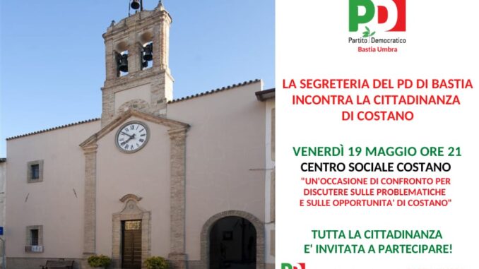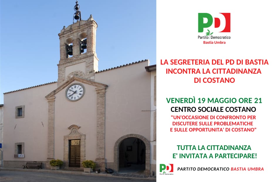 Si invita tutta la cittadinanza a partecipare all'incontro che il Partito Democratico di Bastia terrà a Costano. Sarà un'occasione di confronto per discutere sulle problematiche e sulle opportunità di questa comunità, abbandonata dall'Amministrazione dopo i tanti proclami elettorali non rispettati.